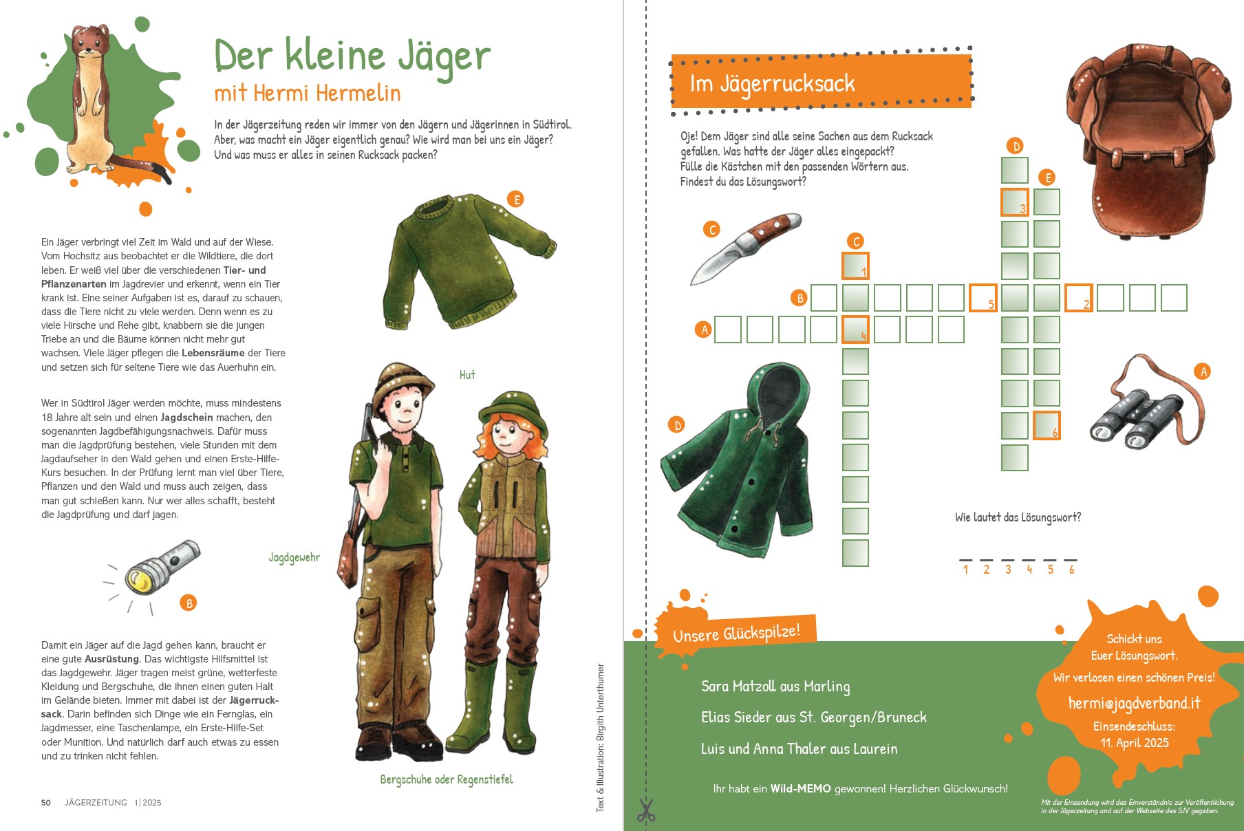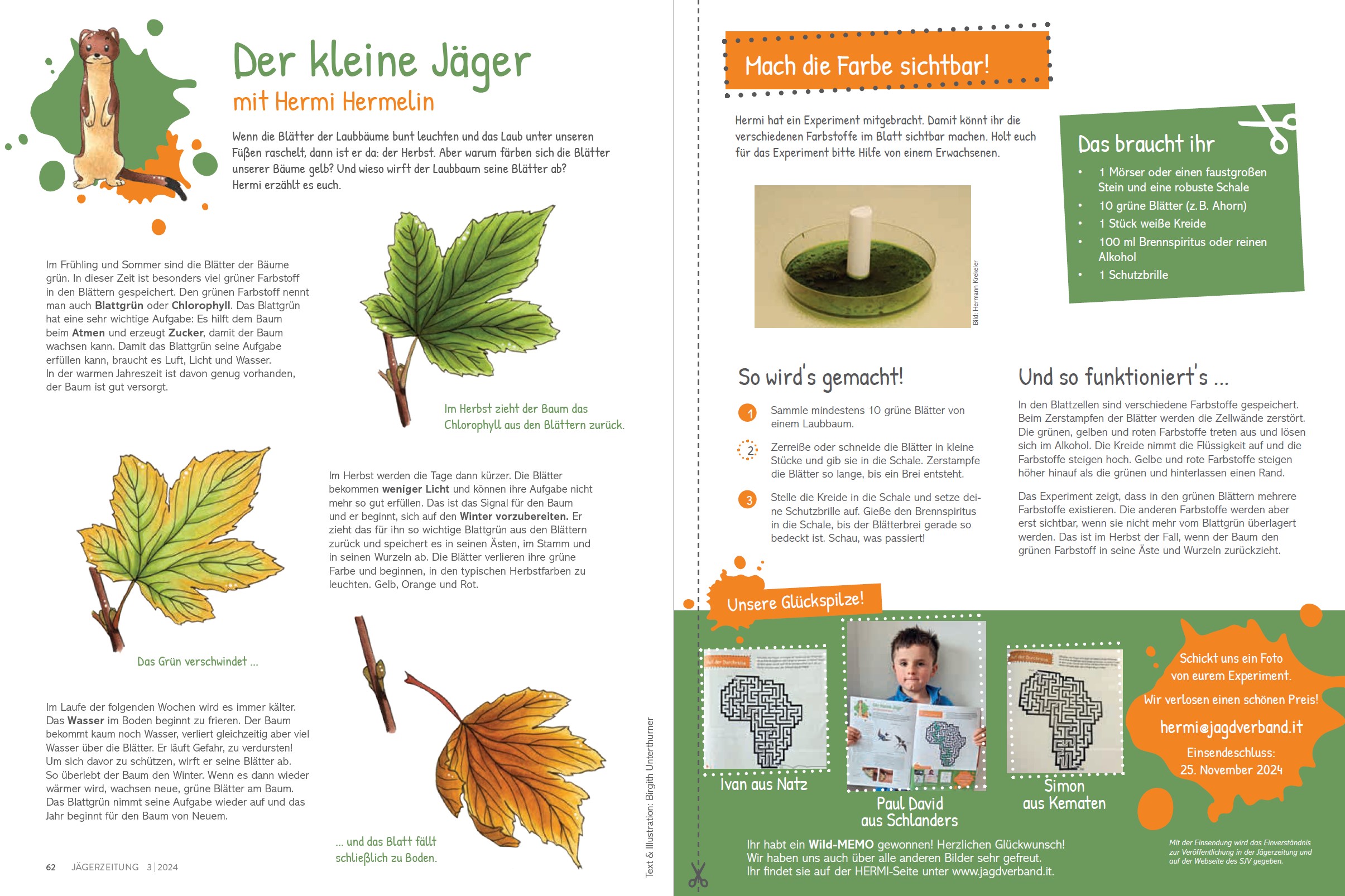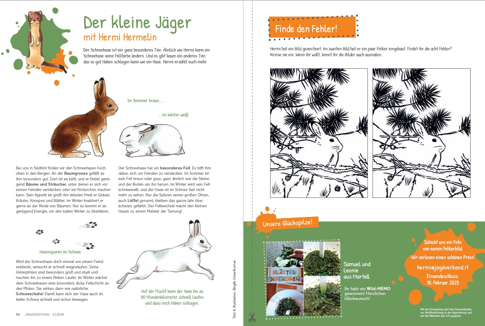 „Der kleine Jäger“, so heißt unsere Kinderseite in der Südtiroler Jägerzeitung. Das Maskottchen Hermi Hermelin führt euch durch Südtirols Ökosysteme, besucht mit euch seine Freunde, die Wildtiere, und bringt euch in jeder Ausgabe etwas zum Malen, Basteln oder Spielen und ein Gewinnspiel mit.