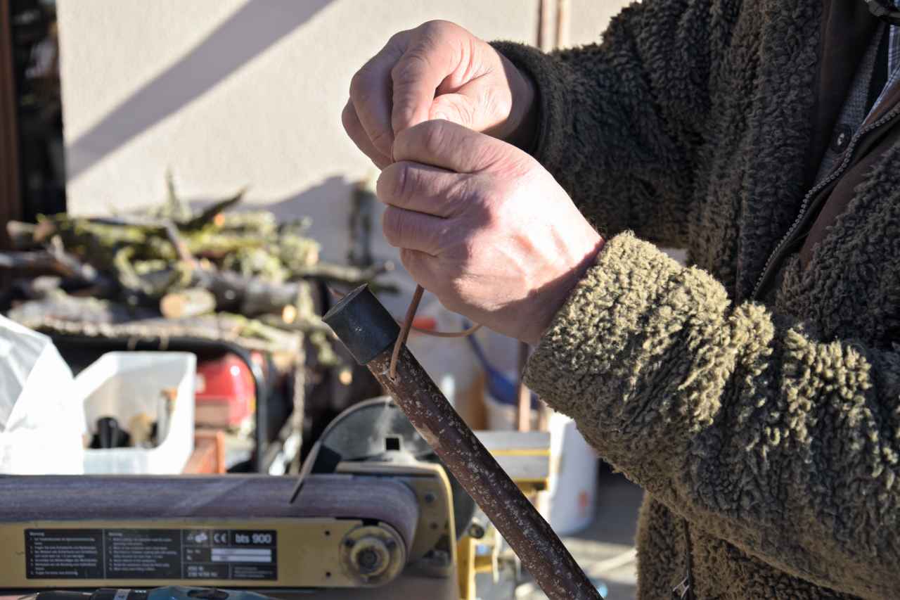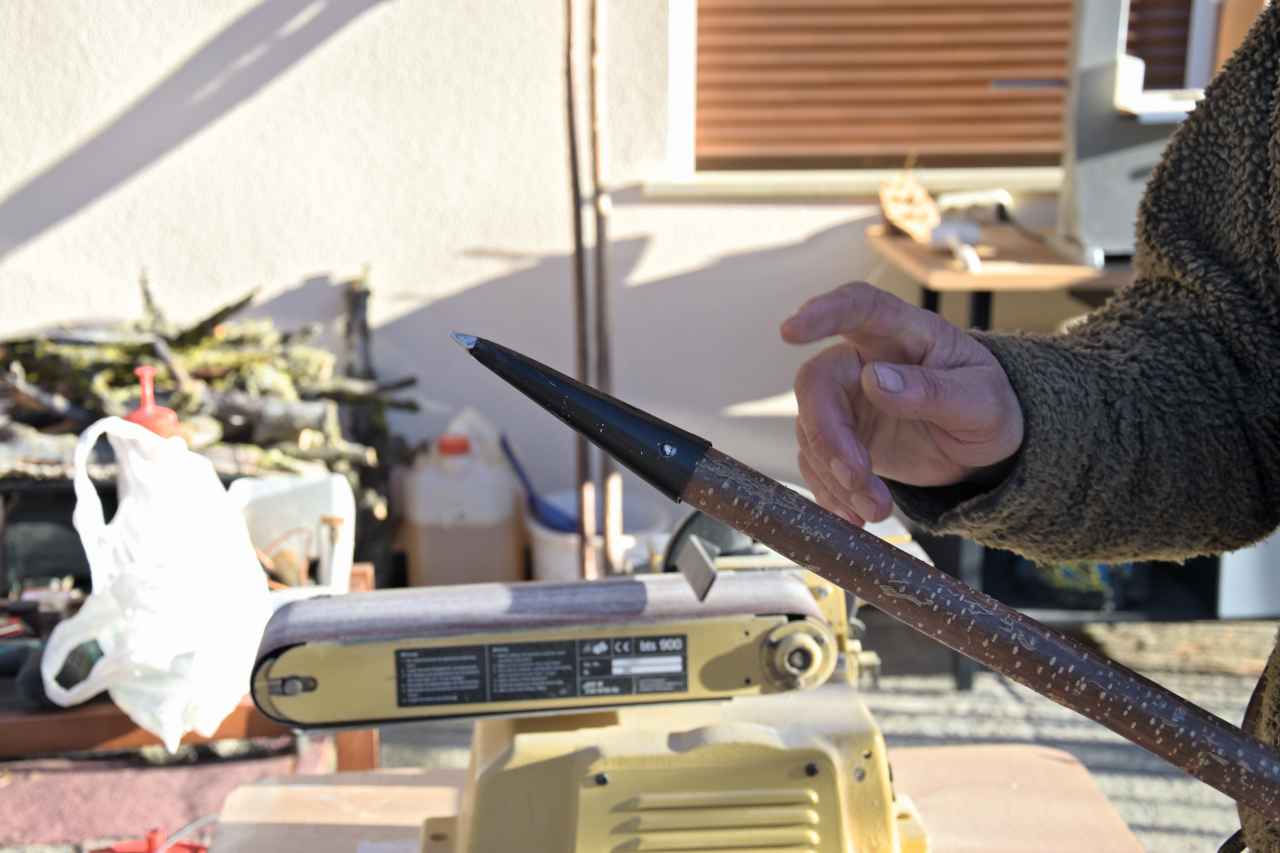 Il bastone essiccato va tagliato alla giusta lunghezza con una sega a nastro. Walter Götsch consiglia un’altezza a livello degli occhi. Non sempre è necessaria la punta di metallo, ma se si cammina su un terreno ghiacciato, il bastone avrà sicuramente maggiore presa. Walter applica la punta all’estremità più spessa del bastone, dopo averla affilata grossolanamente con una sega. Con la smerigliatrice si rifinisce la punta in modo che poi si adatti perfettamente.