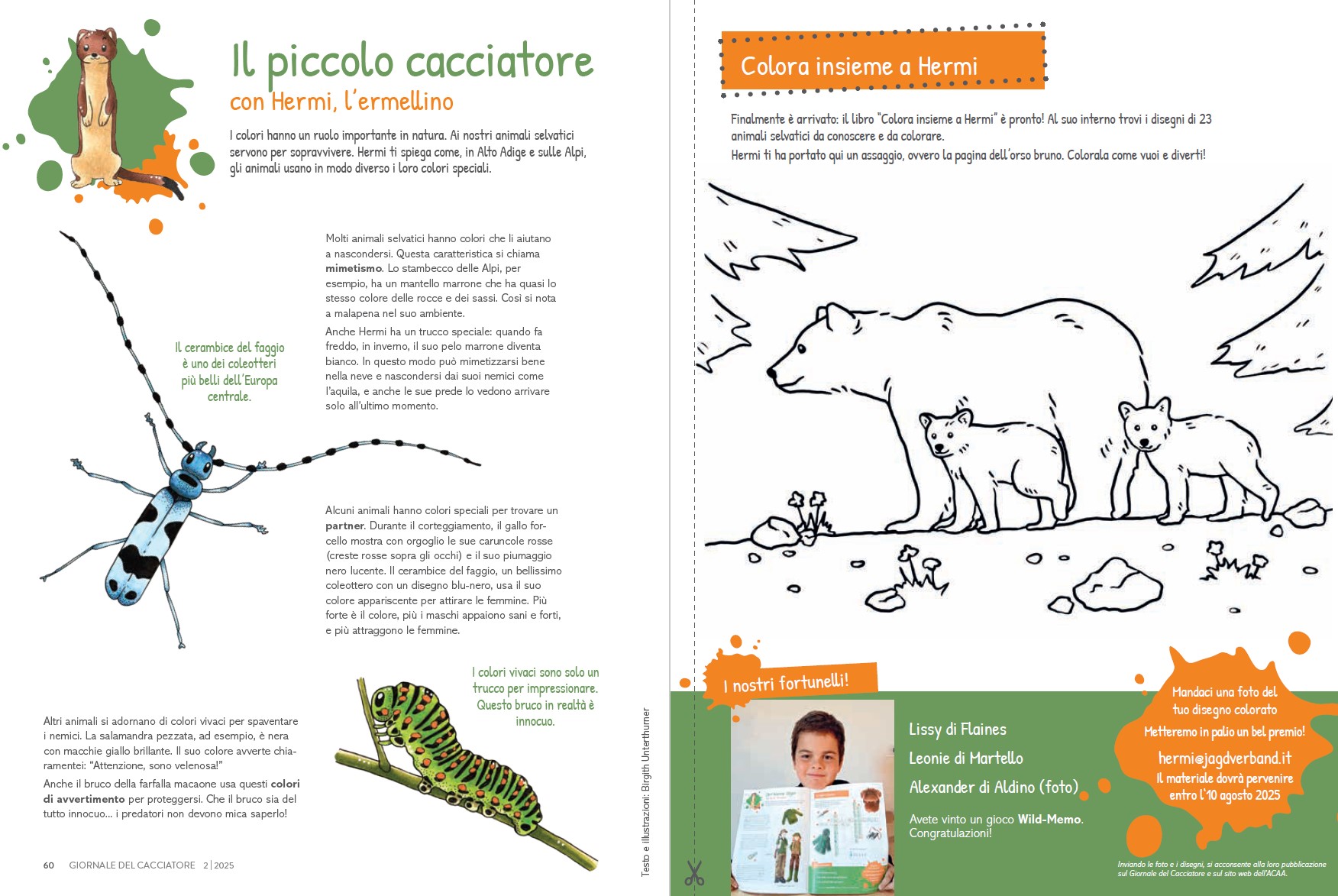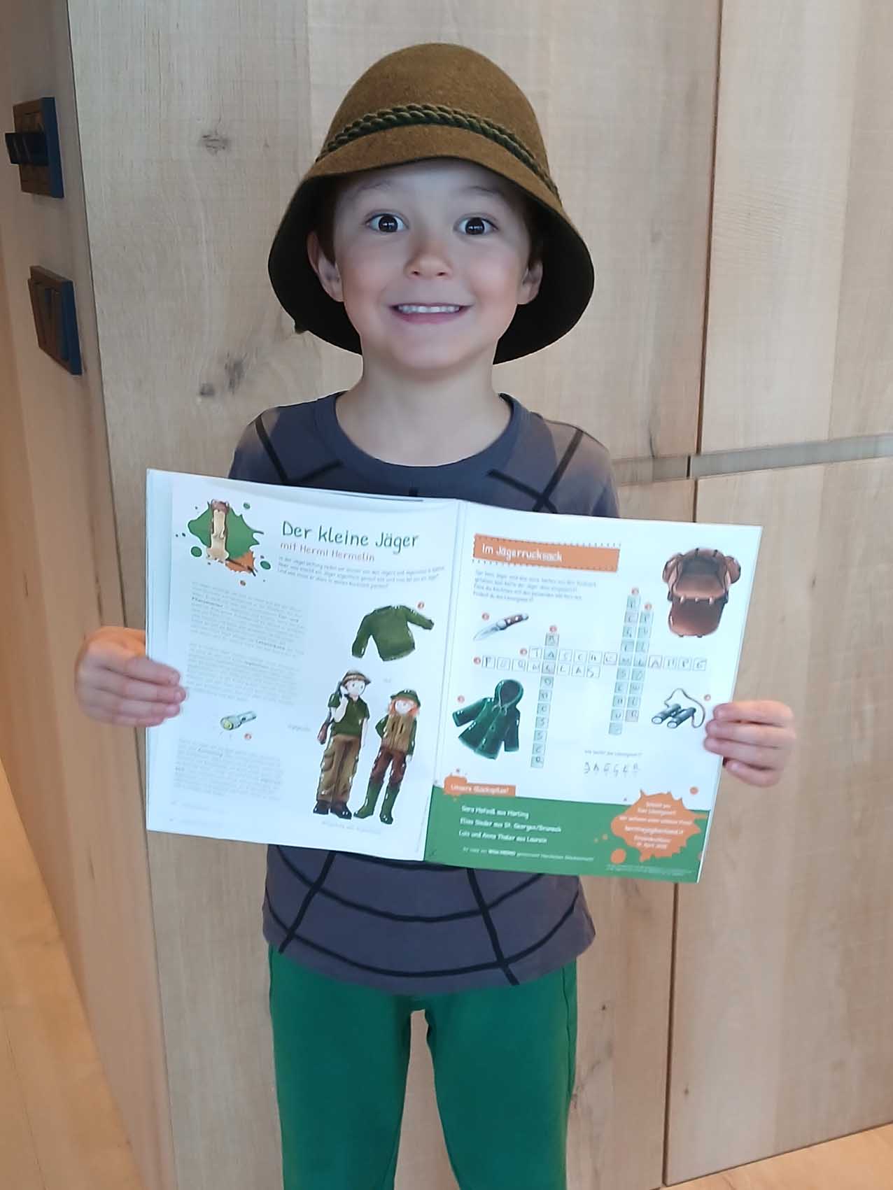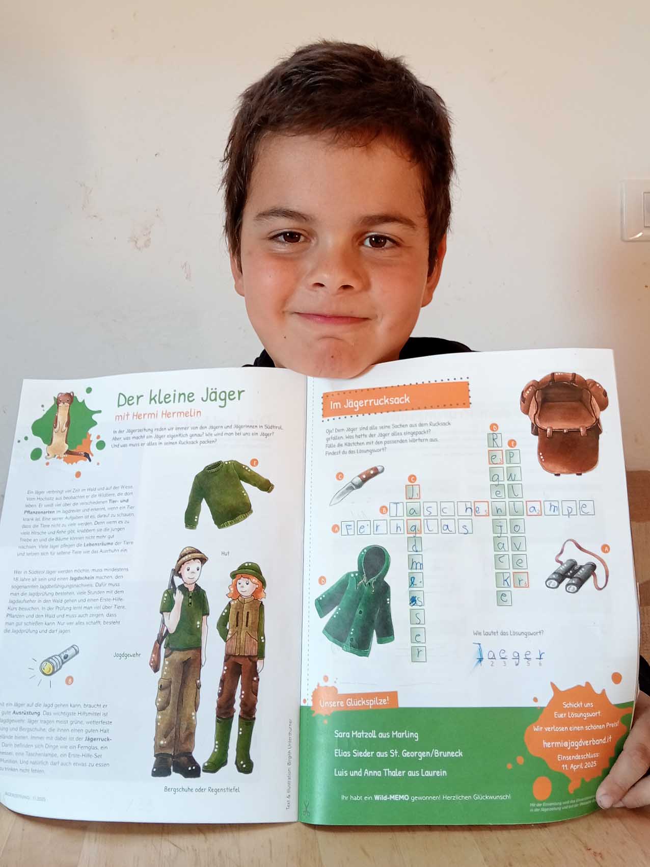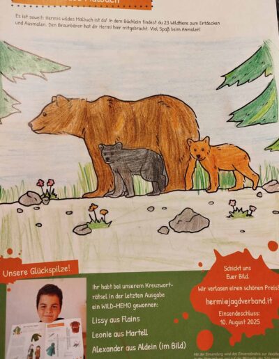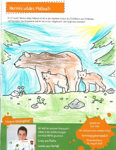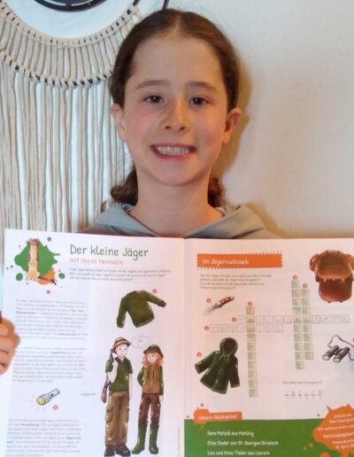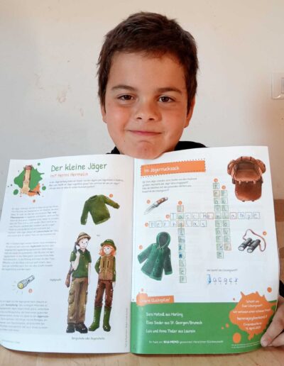 “Il piccolo cacciatore”, così si intitola la nostra pagina per bambini nel Giornale del Cacciatore. La mascotte, l’ermellino Ermi, vi accompagna attraverso gli ecosistemi dell’Alto Adige, vi porta a conoscere i suoi amici, cioè gli animali selvatici, e in ogni edizione vi propone qualcosa di divertente da dipingere, giocare, costruire con le vostre mani, oltre ad un favoloso gioco a premi.