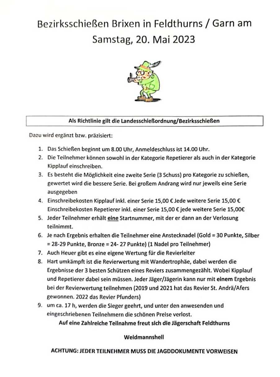 Das Bezirksjägerschießen 2023 von Brixen findet heuer am Samstag 20. Mai in Garn im Revier Feldthurns statt.