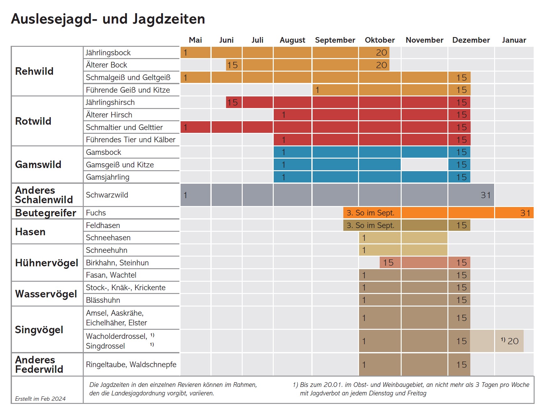 Die Jagd auf Schalenwild ist an sieben Tagen pro Woche erlaubt. Niederwild darf der Jäger an maximal drei Tagen pro Woche bejagen. Jeder Jagdgang auf Niederwild ist vorher im Kontrollkalender zu vermerken. Nach dem allgemeinen Jagdende am 15. Dezember ist nur mehr die Jagd auf Sing- und Wacholderdrosseln ausschließlich in Obst- und Weinanlagen sowie auf das Schwarzwild und den Fuchs erlaubt. Hier gibt es allerdings immer wieder kurzfristige Abänderungen.