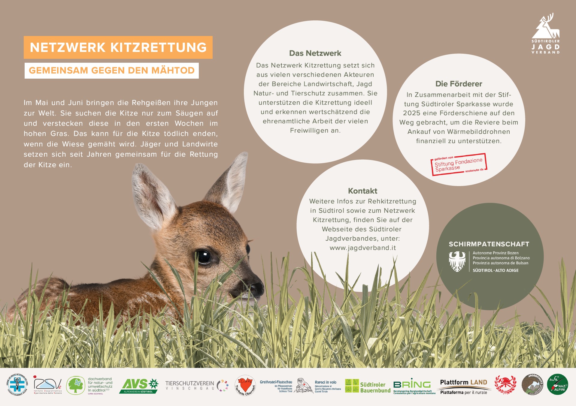 Am 4. August 2025 wurde das „Netzwerk Kitzrettung – gemeinsam gegen den Mähtod“ der Öffentlichkeit vorgestellt, hier geht es zum Beitrag: jagdverband.it/neues-netzwerk-kitzrettung-gemeinsam-gegen-den-maehtod