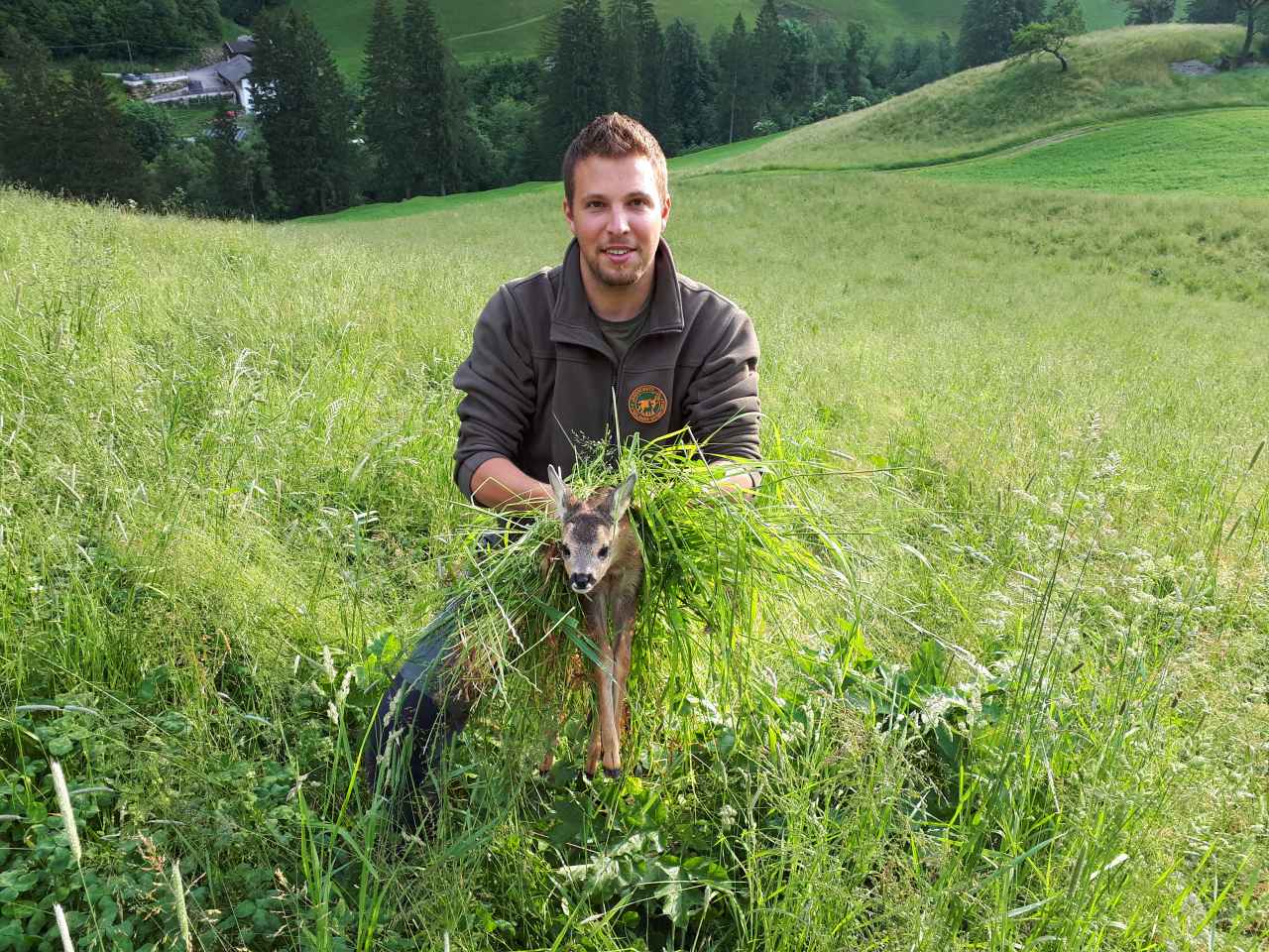 - Nach der Mahd muss das Kitz gleich wieder freigelassen werden. Die Geiß ist nie weit weg und holt es ab.
