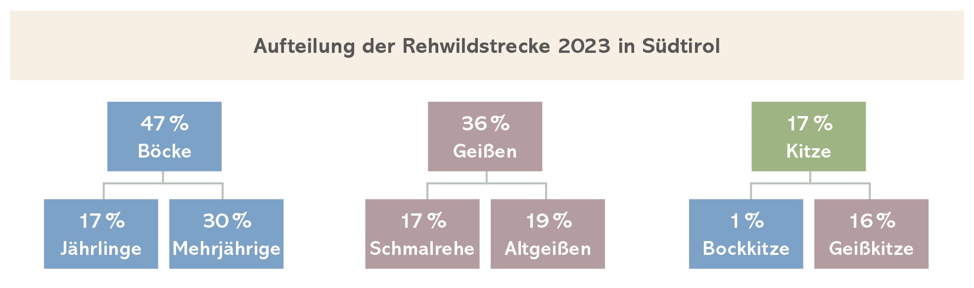 Auch beim Rehwild ist die Sozialstruktur wichtig. Für einen vitalen Bestand sollte sich der Abschuss ungefähr gleichmäßig auf alle Klassen verteilen. In Südtirol gibt es massive Unterschiede in den verschiedenen Altersklassen. Wir schießen uns ein hohes Durchschnittsalter bei den Altgeißen herbei. Das wirkt sich negativ auf die Vitalität der Bestände aus. Der hohe Eingriff bei jungen und mittelalten Trophäenböcken ist alles andere als gut für unser Rehwild.