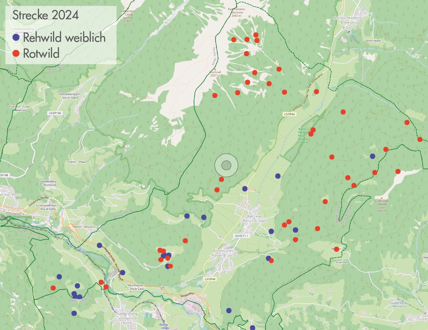 Verortung der Abschüsse des weiblichen Rehwildes (blau) und Rotwild (rot) in einem Südtiroler Revier. Auf einem Großteil der Fläche wird weibliches Rehwild schlichtweg nicht bejagt. Ein Grund dafür könnte sein, dass große Revierteile ausschließlich der Rotwildjagd vorbehalten sind.