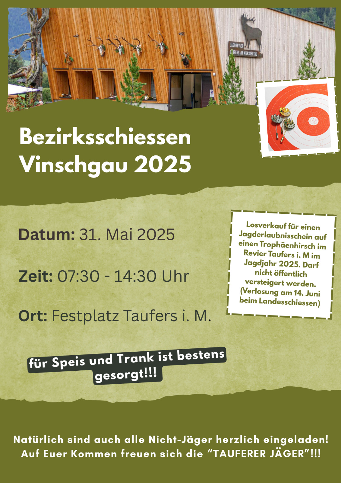 Das Bezirksjägerschießen des Vinschgau findet heuer am 31. Mai auf dem Festplatz in Taufers im Münstertal statt.
