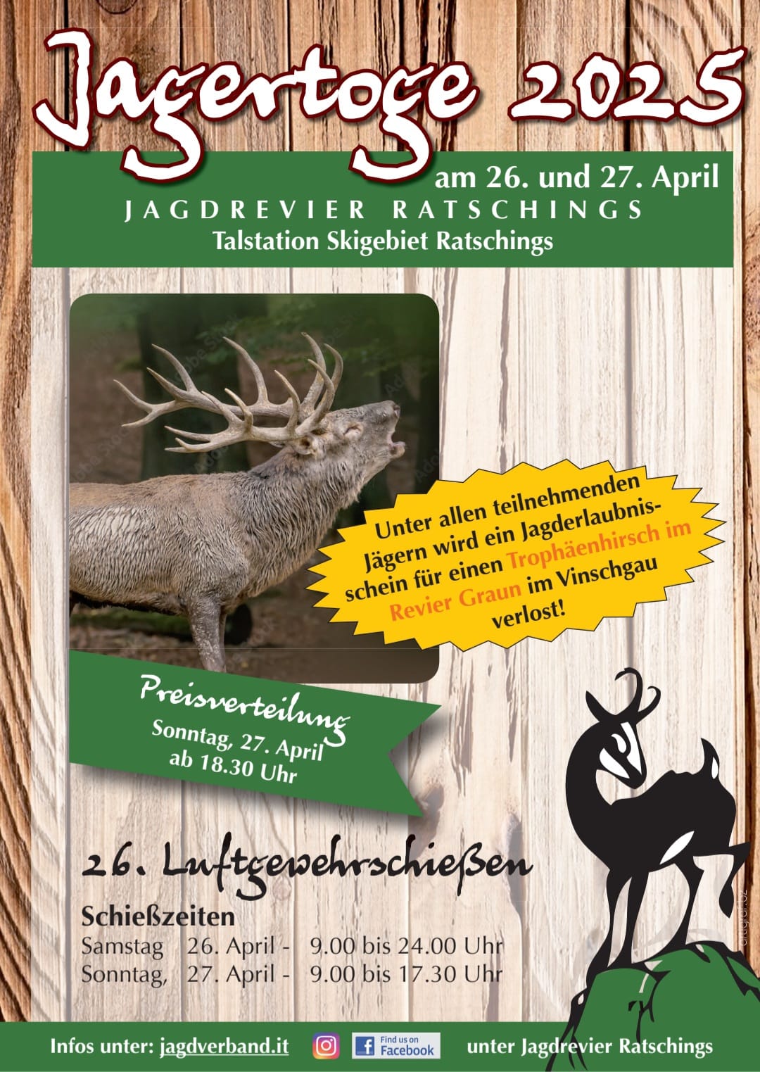 Am 26. und 27. April 2025 organisiert das Jagdrevier Ratschings in der Talstation des Skigebietes Ratschings die Jagertoge 2025. Jäger und Nichtjäger, Alt und Jung können sich an zwei Tagen im Luftgewehrschießen beweisen. Es winken schöne Sachpreise.